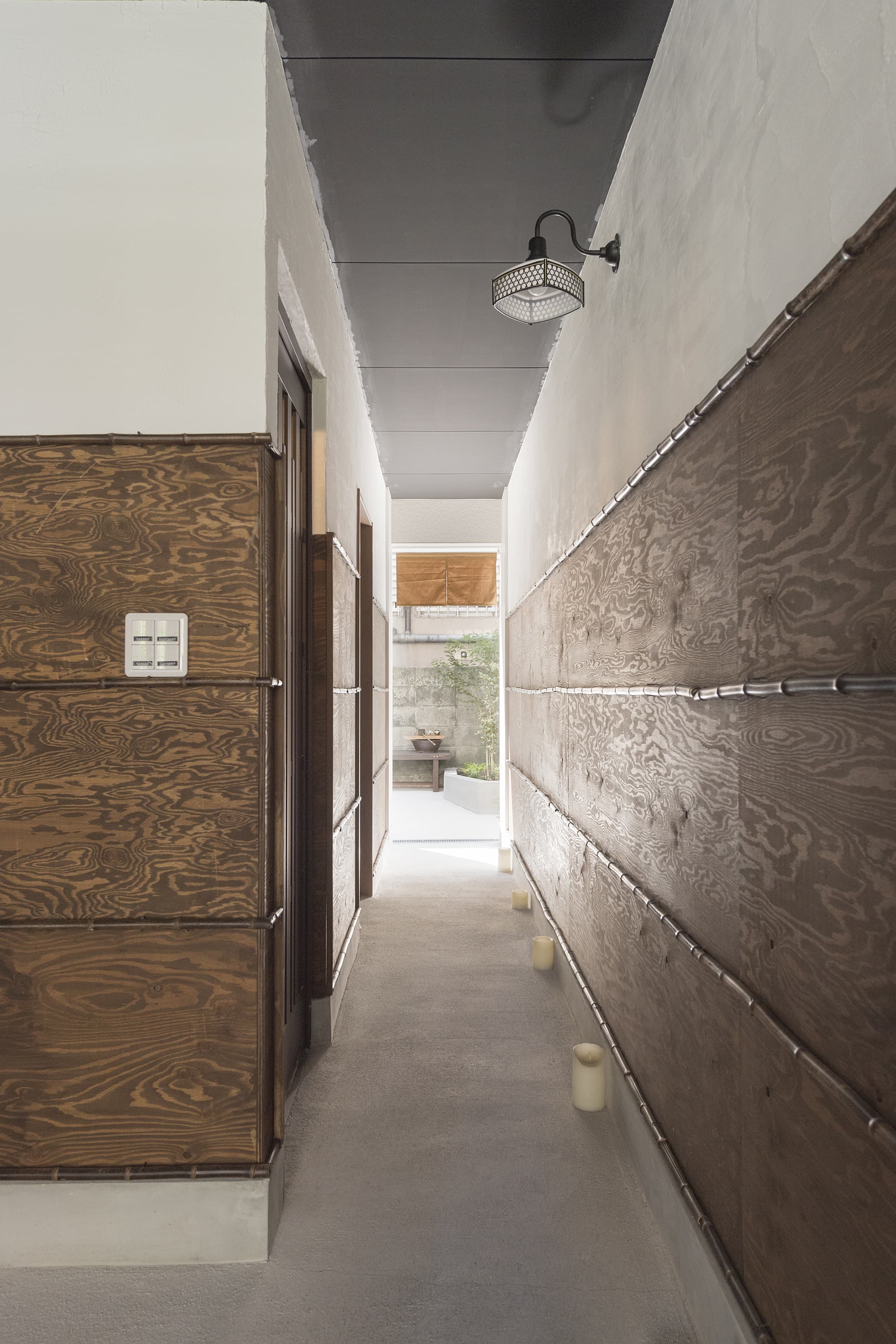 玄関前の土間の横は京都の路地裏のような通路。奥に駐輪スペースを確保