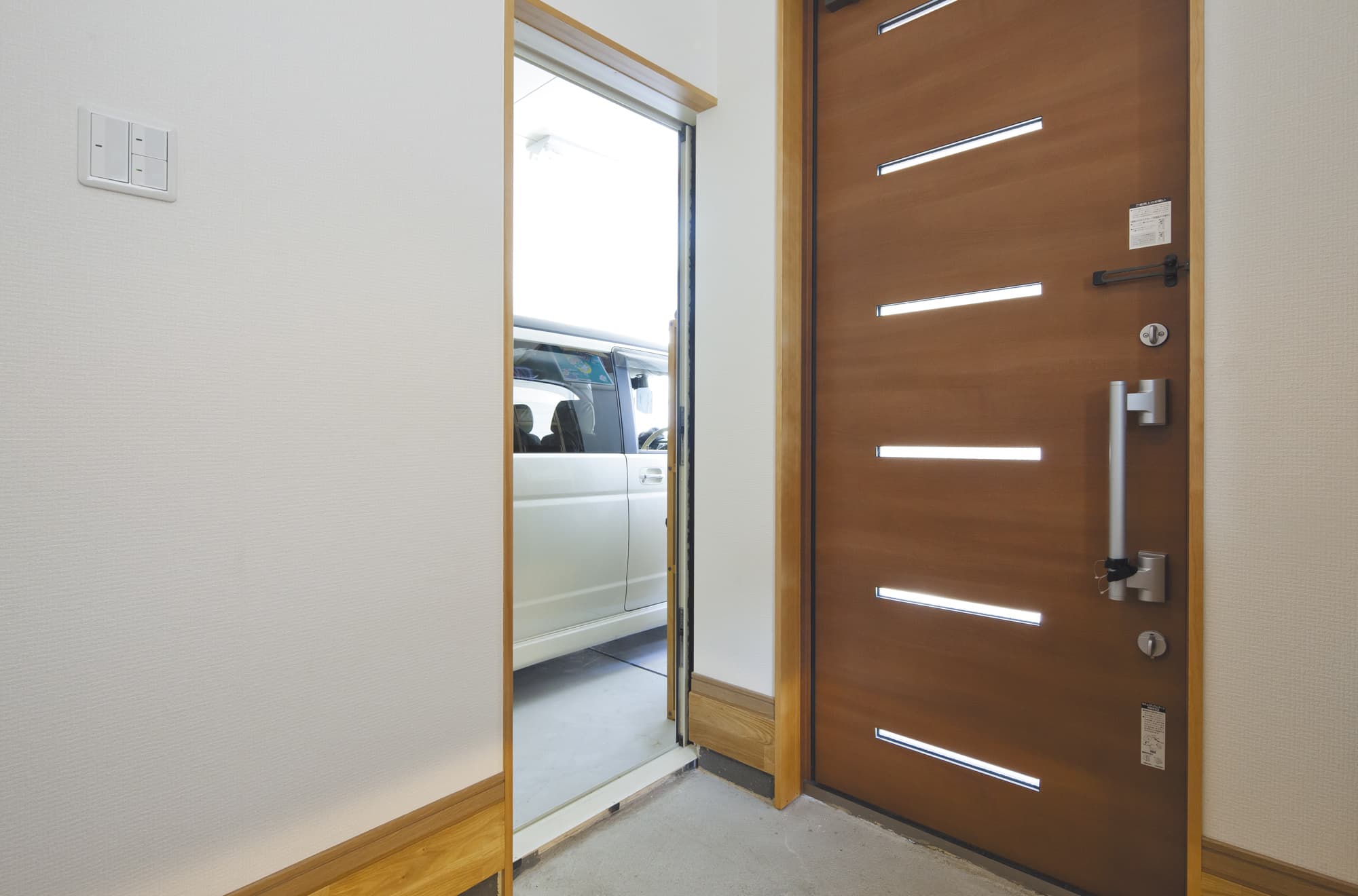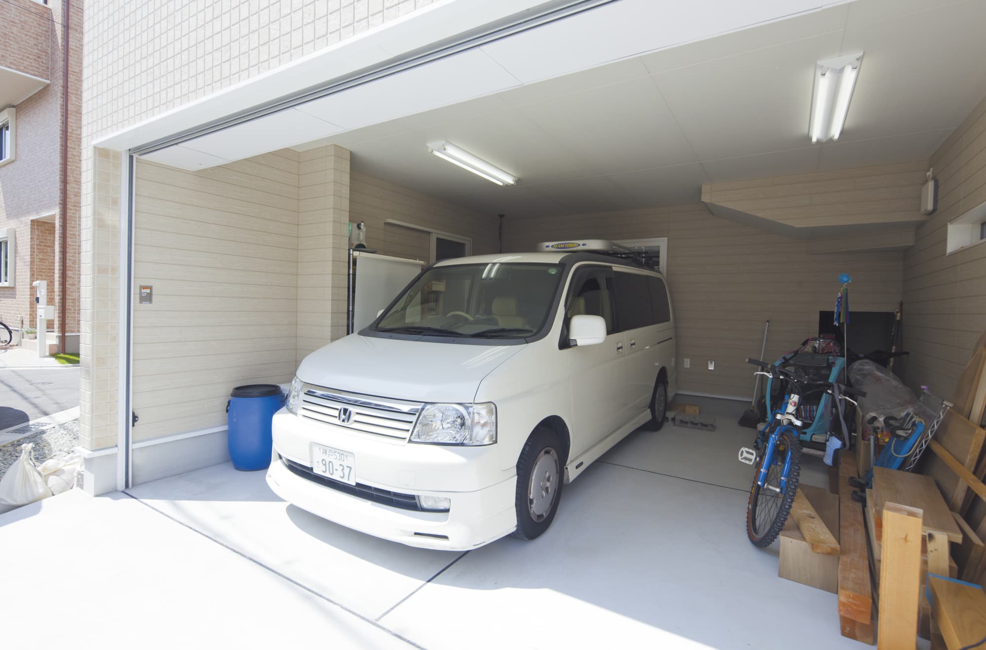 テクノフレーム工法の強さを活かし、2台分のビルトインガレージと屋上のある家